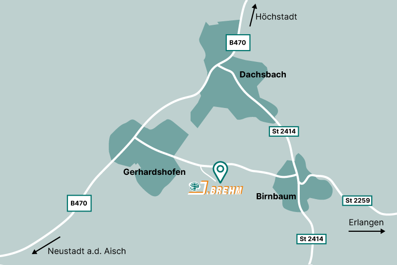 Unser Firmensitz in Gerhardshofen ist zentral im mittelfränkischen Raum am der B470 gelegen – von hier aus sind wir schnell in Neustadt an der Aisch, Erlangen, Höchstadt, Scheinfeld und Umgebung. Parkmöglichkeiten finden Sie direkt vor Ort.